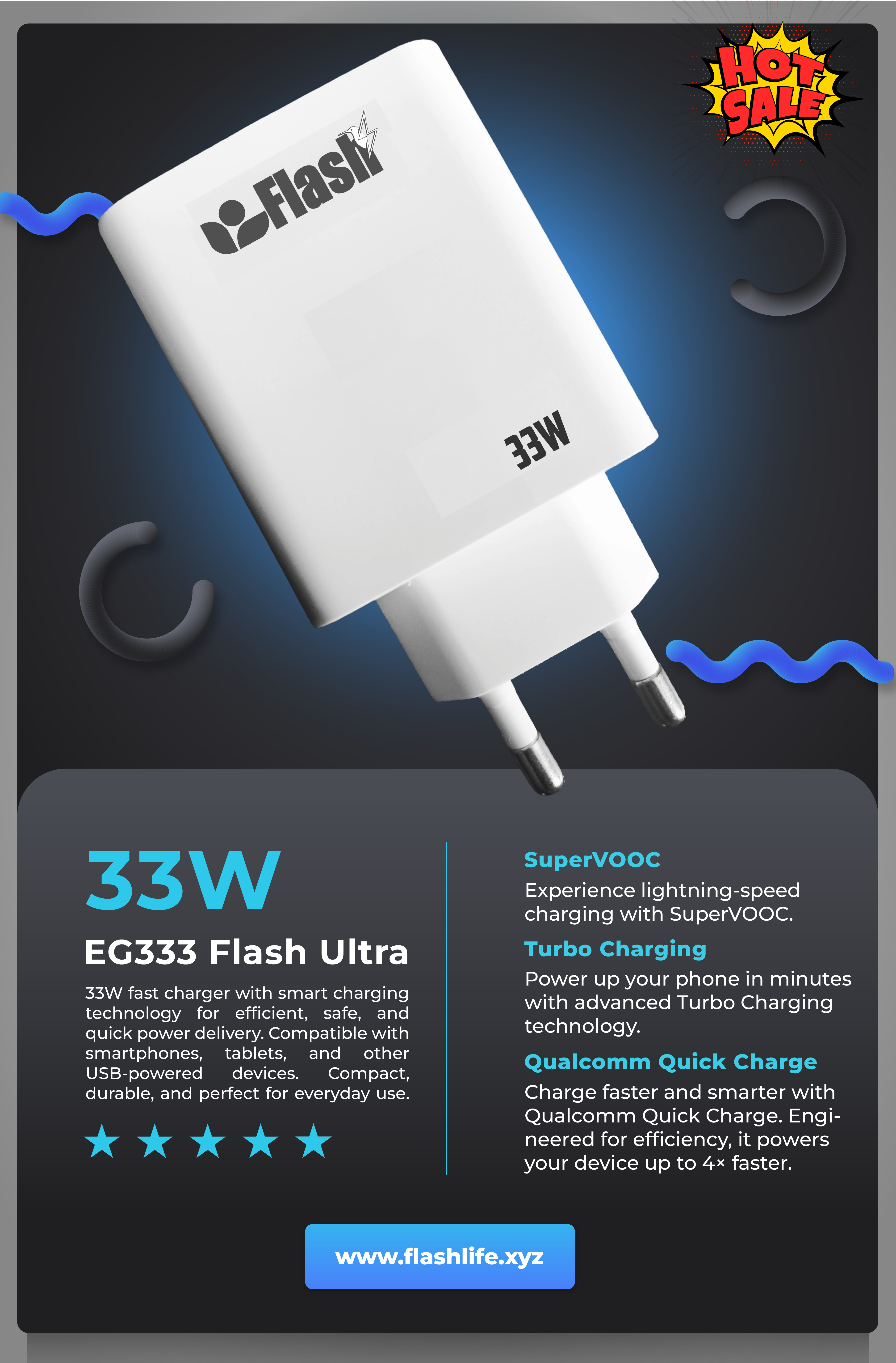 EG333 Flash Ultra 33W QC4.0 Fast/Quick/Turbo/Super VOOC Charger is a fast and efficient charging solution for mobile devices. With modern technology and a convenient design, this product not only helps you save time but also ensures safety when used.